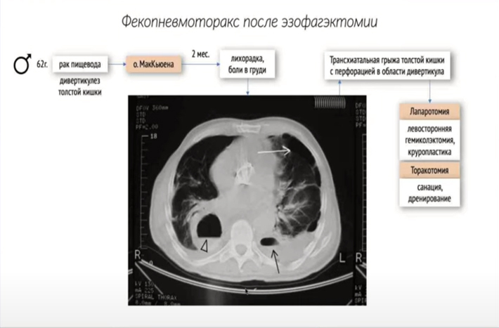 9. Торакоабдоминальная секция. Ведущие специалисты в области лечения опухолей грудной клетки и органов брюшной полости рассказали, какие новейшие методы лечения используются сегодня. Прозвучали лекции по возможностям иммунотерапии, осложнениям резекции желудка, ангиопластике после вмешательств и прочему. Александров О.А. дал информацию о казуистических случаях в онкохирургии. В частности, он рассказал о случае развития фекопневматоракса после эзофагэктомии.